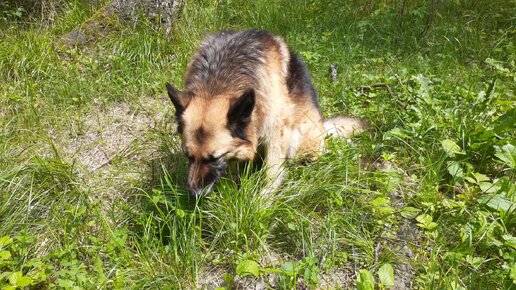 Собака Кира ест траву