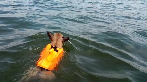 Собака французский бульдог плывет в спасательном жилете