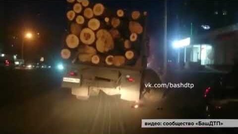 В Уфе у груженого бревнами грузовика прямо на ходу оторвалось колесо