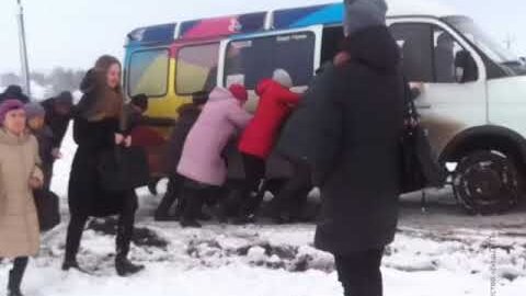 В социальные сети попало видео того, как пассажиры маршрутки толкают автобус