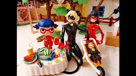 Семья Леди Баг и Супер-Кота. Мама Леди Баг и папа Супер-Кот с детьми на прогулке