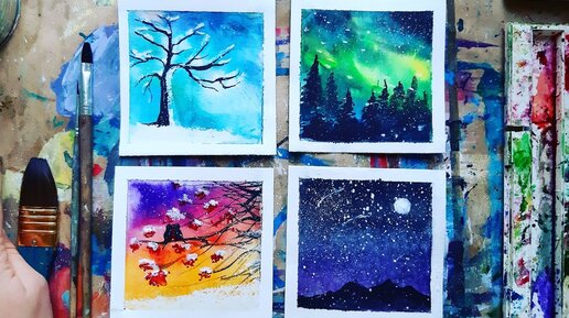 Акварельные открытки своими руками |Рисуем зимние пейзажи просто🎨