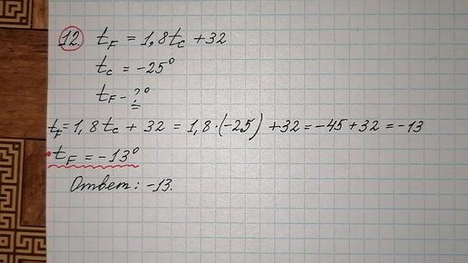 12) Чтобы перевести значение температуры по шкале Цельсия в шкалу Фаренгейта, пользуются формулой tF=1,8tC+32, где tC- температура в градусах Цельсия