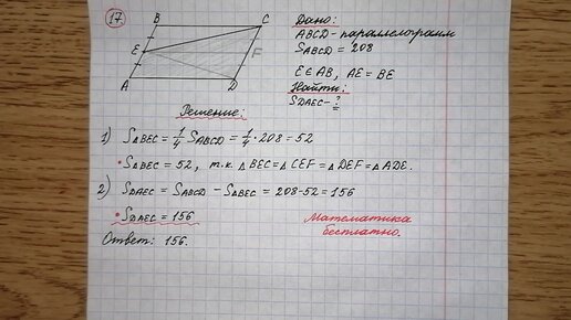 17) Площадь параллелограмма ABCD равна 208. Точка E - середина стороны AB. Найдите площадь трапеции DAEC. Номер 17 огэ 2021.