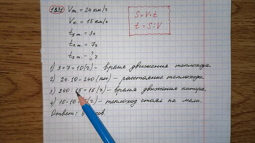 1831) От пристани одновременно отчалили в одном направлении теплоход и катер. Скорость теплохода 24км/ч, скорость катера 15км/ч. Через 3ч пути