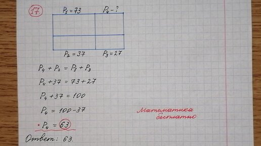 16)Прямоугольник разбит на четыре меньших прямоугольника двумя прямолинейными разрезами. Периметры трёх из них, начиная с левого верхнего и далее