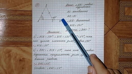 15)В равнобедренном треугольнике ABC с основанием AC внешний угол при вершине C равен 123°. Найдите величину угла BAC. Номер 15 демоверсия ОГЭ 2021