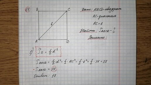 Найдите площадь квадрата, если его диагональ равна 6. Решу огэ. Решение задач. Канал Математика бесплатно.
