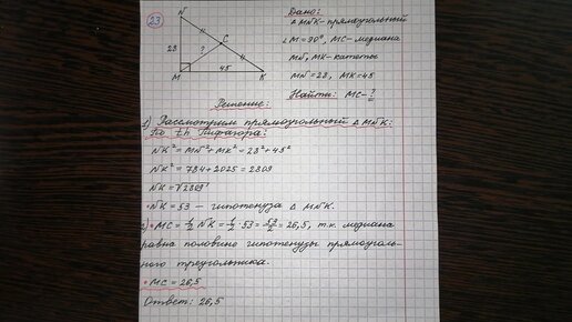 23) В прямоугольном треугольнике MNK с прямым углом M известны катеты: MN=28,MK=45. Найдите медиану MC этого этого треугольника.