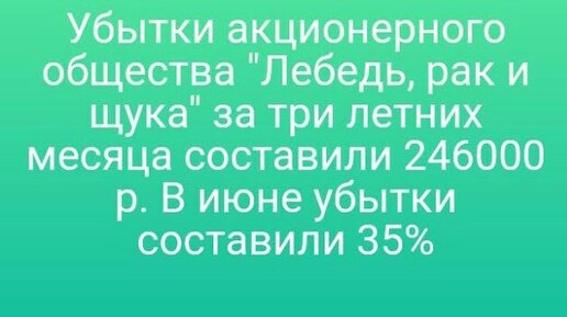 1079)Убытки акционерного общества "Лебедь, рак и щука" за три летних месяца составили 246000 р. В июне убытки составили 35% этой суммы, а финансовые
