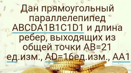 Дан прямоугольный параллелепипед ABCDA1B1C1D1 и длина ребер, выходящих из общей точки AB=21 ед.изм., AD=16ед.изм., AA1=12 ед.изм. Определи длину