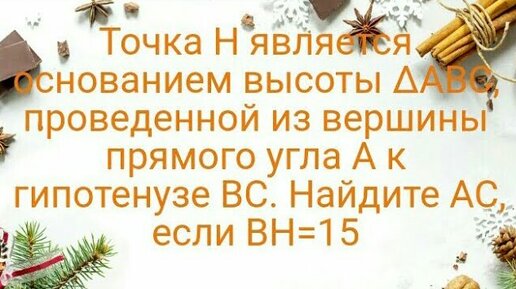 Точка H является основанием высоты ∆ABC, проведенной из вершины прямого угла A к гипотенузе BC. Найдите AC, если BH=15, BC=64. Вариант 18.