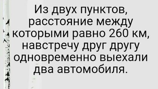1090)Из двух пунктов, расстояние между которыми равно 260 км, навстречу друг другу одновременно выехали два автомобиля. Скорость одного