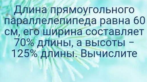 1081)Длина прямоугольного параллелепипеда равна 60 см, его ширина составляет 70% длины, а высоты − 125% длины. Вычислите объем параллелепипеда.