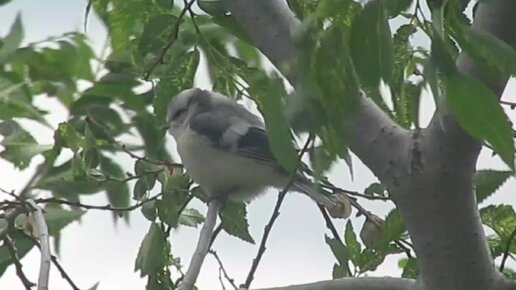 Желторотый птенчик белой лазоревки покинул гнездо и сидит на ветке напротив нашего окна