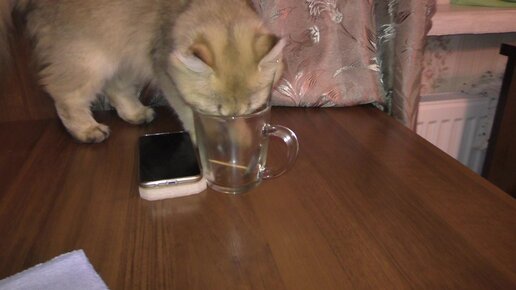 Кошка Юся достает зубочистку из кружки.
