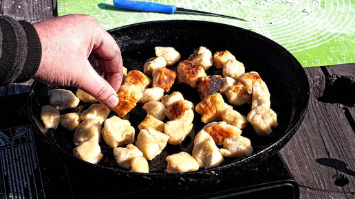 Если нет шашлыка под рукой на природе, то можно приготовить пельмени без мяса на сковороде по-хакасски