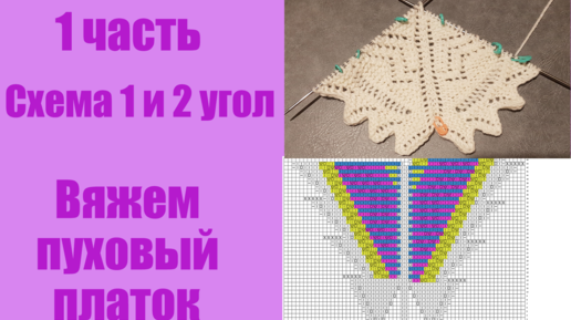 Пуховый платок спицами. Как читать схему 1 и 2 угол.