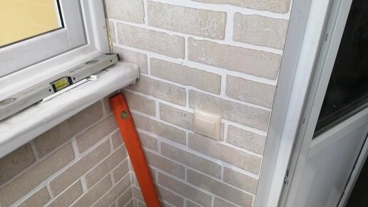 Внутренняя отделка балкона стеновыми МДФ панелями под кирпич, и шкаф на балконе с раздвижными дверцами.