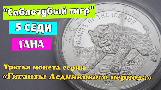 "Саблезубый тигр" третья монета "Гиганты Ледникового периода". Республика Гана 5 седи 2020 серебряная монета.
