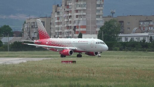 "Суперджет" взлетает на фоне многоэтажек и гор