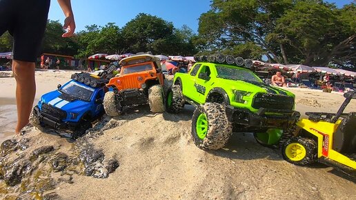 TOY CARS on the Beach. Kids play with cars in puddles