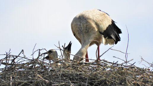 Биосфера. У пары аистов появились птенцы. Их немного видно. Вот почему аисты строят такие большие гнёзда!