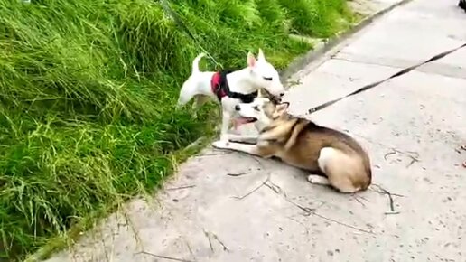 Наконец-то встретились два влюбленных пушистика: щенок Алиска и ее кавалер. Игрались и кувыркались так, что сами устали