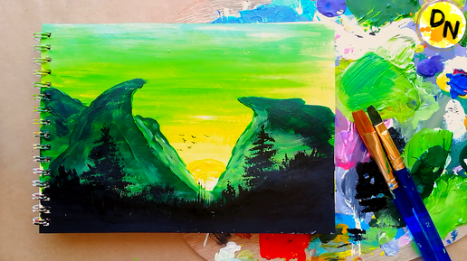 ЗЕЛЕНЫЙ РАССВЕТ: Как нарисовать простой горный пейзаж | Урок рисования акрилом для начинающих