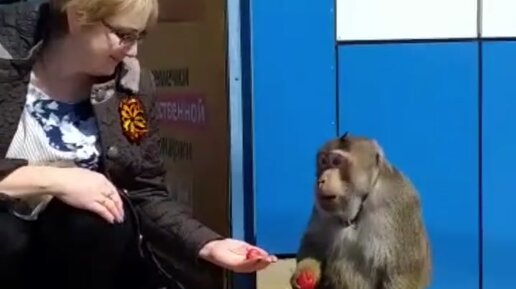 Сбежавшая с выставки животных обезьяна ела помидоры на крыльце магазина