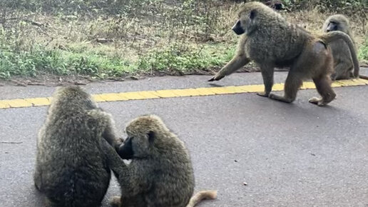 Танзания. Едем на сафари. Стая бабуинов гуляет по шоссе