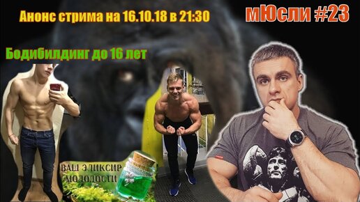Бодибилдинг до 16 лет. Мой эликсир молодости. Анонс стрима на 16 октября 2018. Сашины мЮсли #23