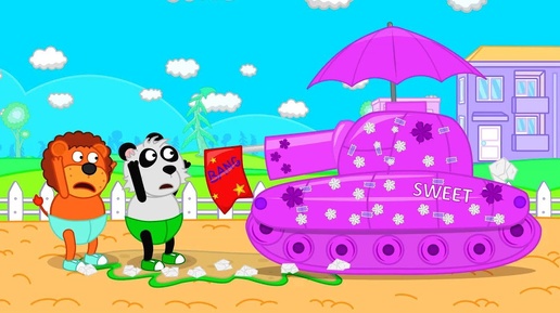 Lion Family Pretend Play with Cardboard Tank