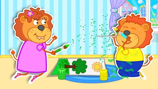 Lion Family Splashes Of Colorful Paints Cartoon For Kids