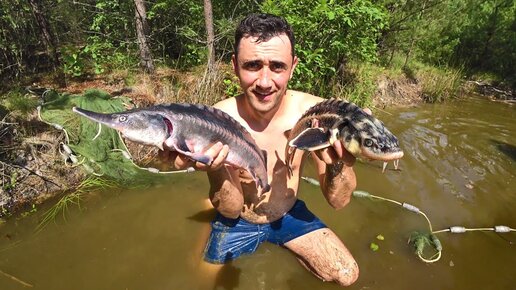 Ловля осетра неводом в пруду! Жарю осетра с грибами картошкой