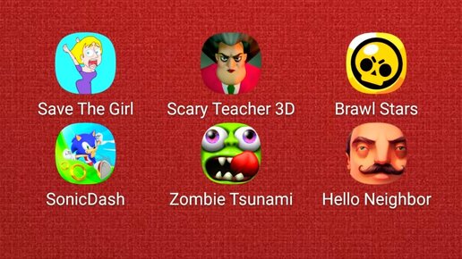 Save The Girl,Scary Teacher,Hello Neighbor,Brawl Stars,SonicDash,Zombie Tsunami