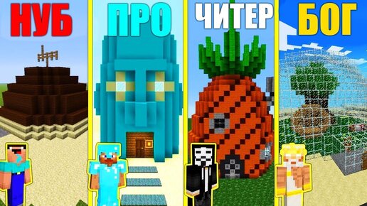 МАЙНКРАФТ БИТВА: НУБ против ПРО против ЧИТЕР против БОГ: ПОСТРОИЛИ ДОМ СПАНЧ БОБА MINECRAFT