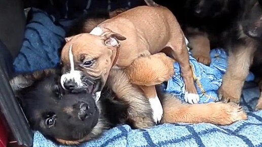 Стафф и Щенки Немецкой Овчарки. Little Killer and German Shepherd puppies.