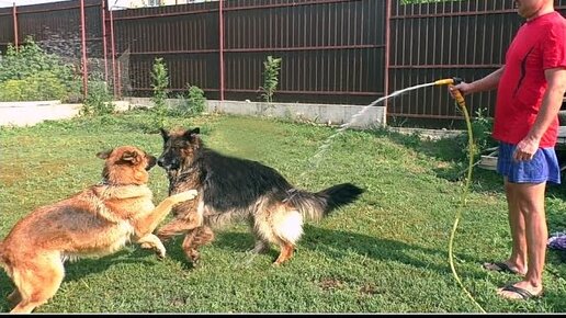 Собаки ловят воду. Dogs catch water. Немецкие Овчарки Дагир и Альма. Одесса.