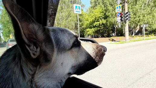 Щен Дар в авто - вынюхивает и выглядывает. Удивляется, как быстро несется улица