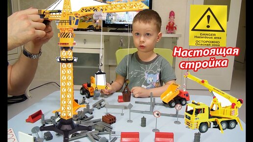 Большой кран и стройка с машинами / Подъемный кран на стройке