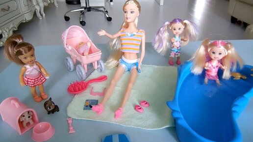 Мультик Барби / Кукольная семья загорает на солнышке и купается в бассейне / Учим английский