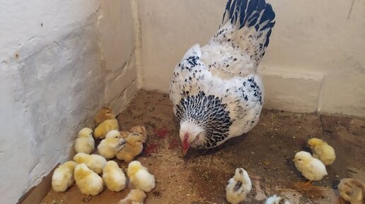 Двухдневные цыплята и курица наседка. Птенцы едят корм и прячутся под маму. Домашние цыплята