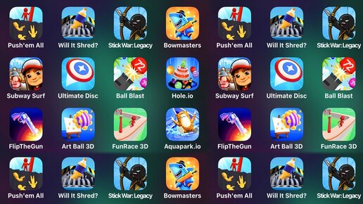 Push'em All, Will It Shred, Stick War Legacy, Bowmasters, Subway Surf, Ultimate Disc, Ball Blast