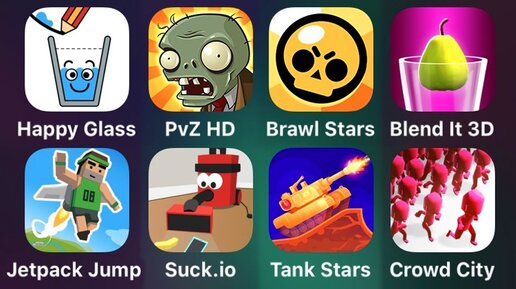 Happy Glass, PvZ, Brawl Stars, Blend it 3d, Jetpack Jump, Suck.io, Tank Stars, Crowd City