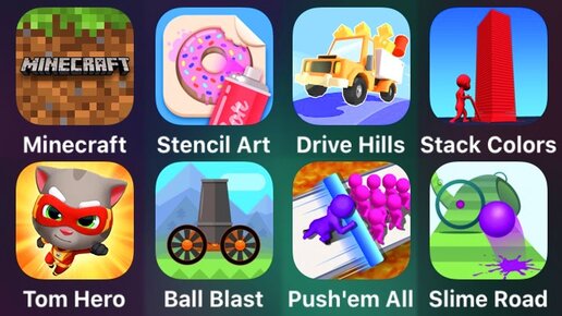 Minecraft, Stencil Art, Drive Hills, Stack Colors, Tom Hero, Ball Blast, Push'em All, Slime Road