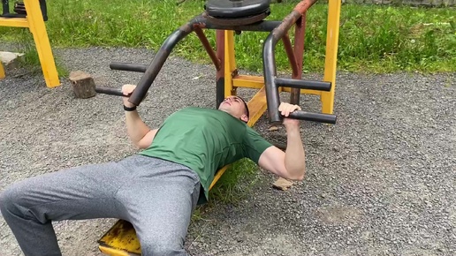 Хорошо когда можно заниматься на улице. Жим лёжа в тренажёре!