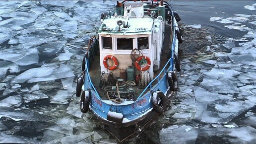 Судно Кузьма колет лед у Москворецкого моста
