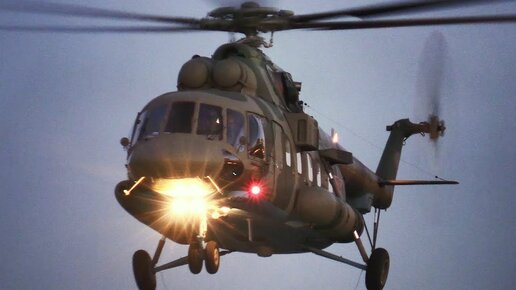 Вечерний прилет вертолета Ми-8АМТШ на Дбр-481 (посадка и взлет)