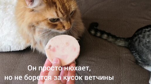 Кошка обжорка борется за кусок ветчины, покусала за уши взрослого кота